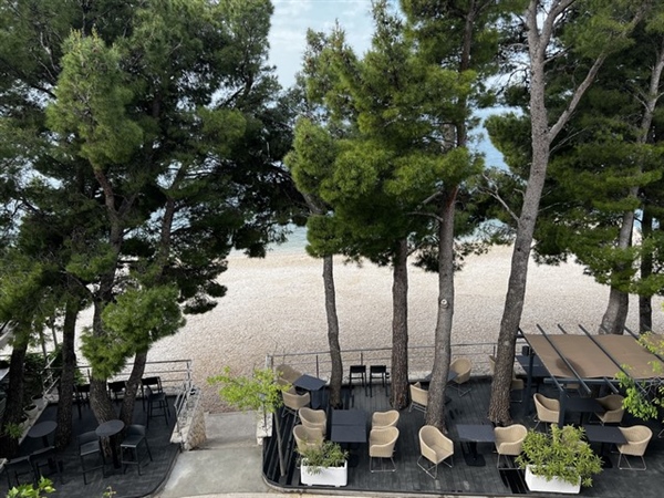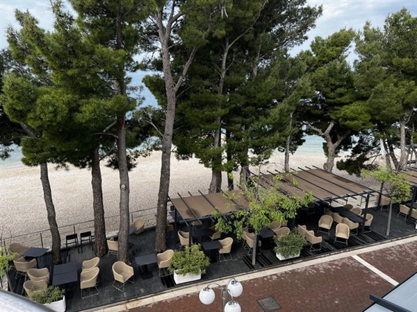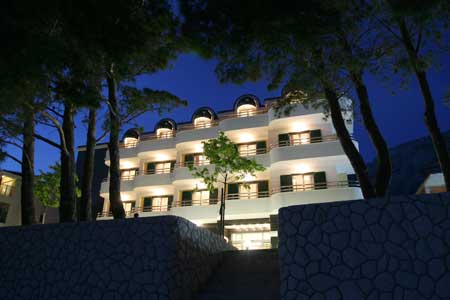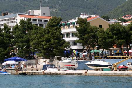 Restoran na terasi nalazi se tik uz plažu i poznatu makarsku šetnicu. Restoran radi po sustavu HACCP. U sjeni borova možete birati između različitih vrsta riba, školjaka i drugih specijaliteta s Jadranskog mora. Za one koji više vole mesni meni, možete započeti s dalmatinskom šunkom i izborom sireva, nastaviti s biftekom s roštilja ili bilo kojim drugim mesnim jelom tipičnim za našu dalmatinsku kuhinju.