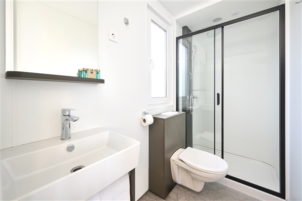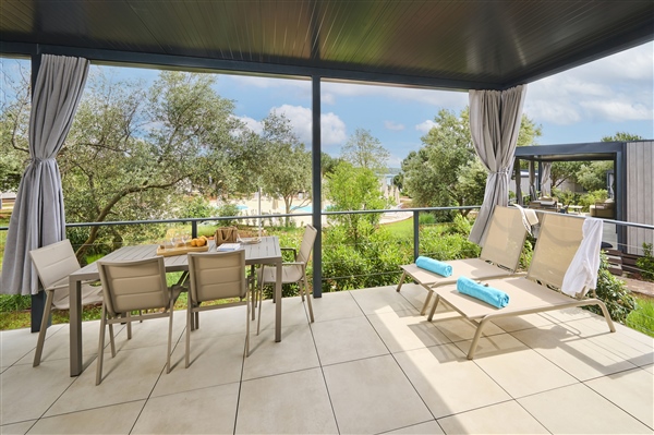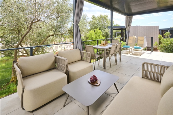 34m², max. 5 osoba, 2 spavaće sobe - jedna s bračnim krevetom, a druga s odvojenim krevetima, kauč u dnevnom boravku za 1 osobu (80x190), 2 kupaonice sa tušem, dnevni boravak sa potpuno opremljenom kuhinjom (aparat za kavu, mikrovalna pećnica, perilica suđa), 25.50 m² terasa sa zavjesama, stolom, 4 stolice i vrtnom garniturom
