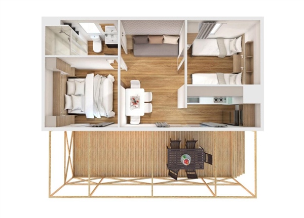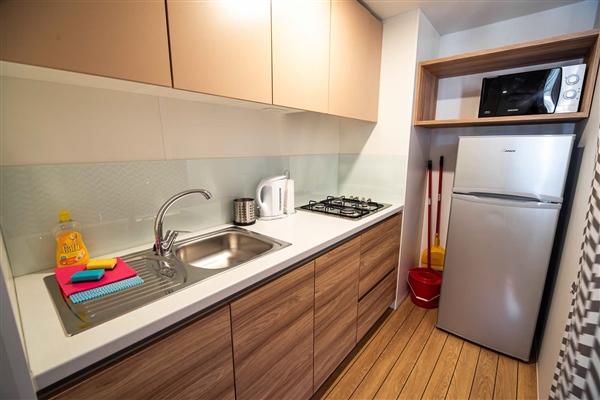 Trosobne mobilne kućice imaju dnevni boravak sa kaučem na rasklapanje, tri sobe i kuhinju (kuhinjski stol, ploča za kuhanje, kuhinjski pribor, kuhalo za vodu, mikrovalna pećnica, hladnjak), kupaonicu (WC, sušilo za kosu, tuš kabina/kada), natkrivenu drvenu terasu, Wi-Fi, TV i klimu.