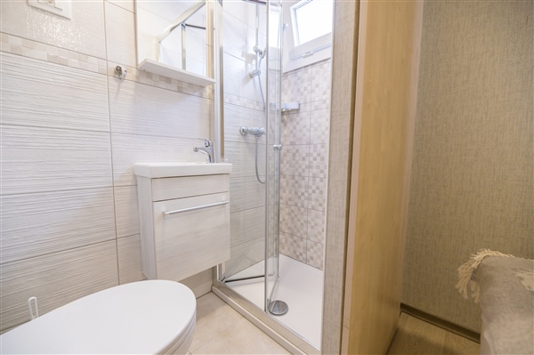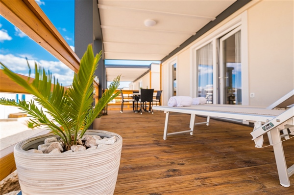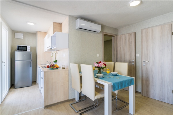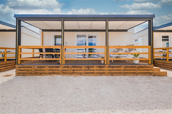 Premium Family mobilna kućica - Komforna kućica, idealna za obitelj sa 4 + 1 osobe. Veličine 39 m2 (7,6 x 5,2 m), sastoji se od 2 spavaće sobe, 2 kupaonice, dnevnog boravka s pomoćnim ležajem te kuhinjske niše. Opremljena klima uređajem, televizijom, prostranom terasom površine 21 m2, sa sjedećom garniturom i ležaljkama. Mobilna kućica uređena je u modernom stilu za najugodniji mogući boravak.