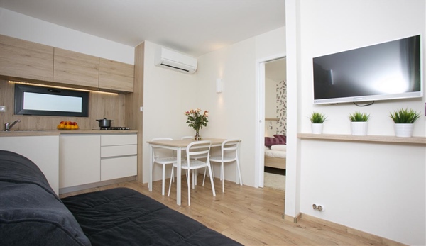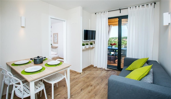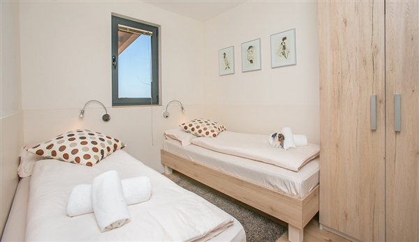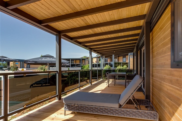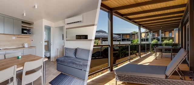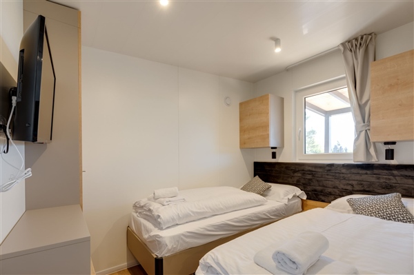 PREMIUM MOBILNE KUĆICE imaju 2 spavaće sobe (jedna sa bračnim krevetom 160x200cm, druga sa dva odvojena kreveta 80x200cm), 2 kupaonice s tuš kabinama i WC-om, kuhinju sa pločom za kuhanje, hladnjakom, perilicom posuđa i mikrovalnom pećnicom, klimatizaciju, SAT TV (3 kom.), terasu s garniturom za sjedenje za 4 osobe.