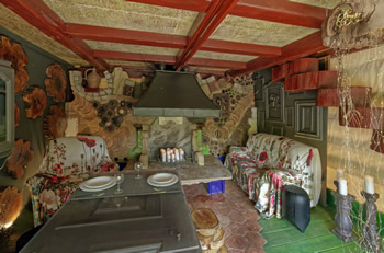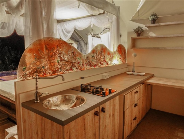 Unutrašnjost šatora osmišljena je s pažnjom prema detaljima, kombinirajući toplinu prirodnih materijala s modernim sadržajima: