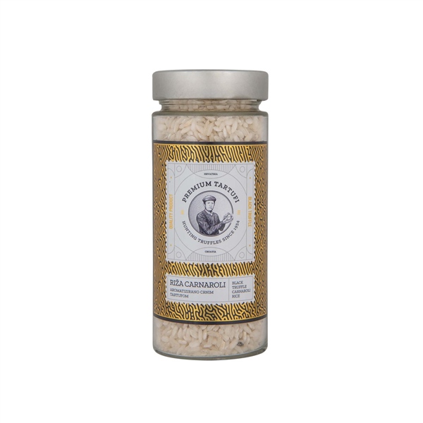 Paket uključuje: Maslinovo ulje aromatizirano bijelim tartufom 250ml, Riža Carnaroli - sa sušenim crnim tartufima -250g, Grissini s tartufom i ekstra djevičanskim maslinovim uljem 120 g , Tartufata sa crnim tartufom 180g