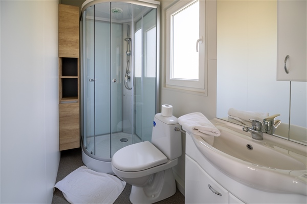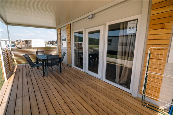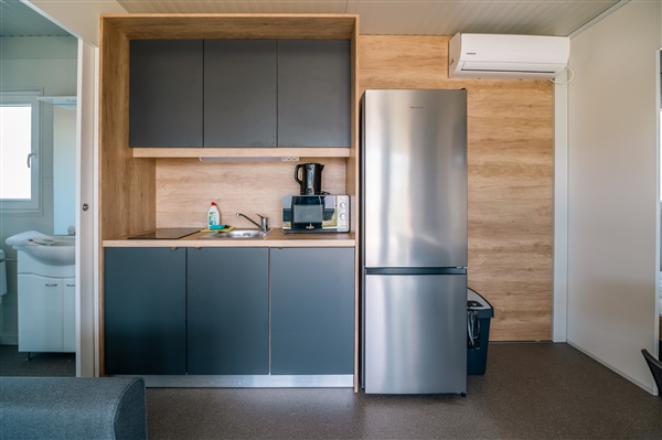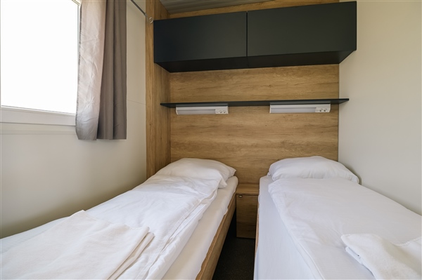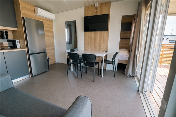 Trosobne mobilne kućice imaju dnevni boravak sa kaučem na rasklapanje, tri sobe i kuhinju (kuhinjski stol, ploča za kuhanje, kuhinjski pribor, kuhalo za vodu, mikrovalna pećnica, hladnjak), kupaonicu (WC, sušilo za kosu, tuš kabina/kada), natkrivenu drvenu terasu, Wi-Fi, TV i klimu.