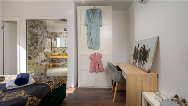 ● Spavaćom sobom za dvoje s iznimno velikim bračnim krevetom (king size) i privatnom kupaonicom (WC, tuš, umivaonik, mašina za pranje rublja, sušilo za kosu)