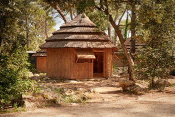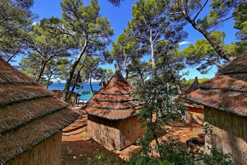 Bungalovi u Pine Beach Pakoštane odišu jednostavnim, a opet očaravajućim šarmom. Kao pravi predstavnici Adriatic Eco Resorta, izgrađeni su isključivo od prirodnih materijala poput trske i drveta, smješteni u hladovini guste borove šume uz more. Konstrukcija ovih jedinstvenih smještajnih jedinica omogućava prirodnu ventilaciju i klimatizaciju, pružajući gostima zasluženi odmor. Bungalovi su pažljivo projektirani bez električnih uređaja, kako bi se izbjegla bilo kakva smetnja urbanog života i omogućilo potpuno uranjanje u prirodu. Gosti imaju na raspolaganju osam zajedničkih, dobro opremljenih sanitarnih čvorova, koji su diskretno raspoređeni i skladno uklopljeni u borovu šumu resorta.