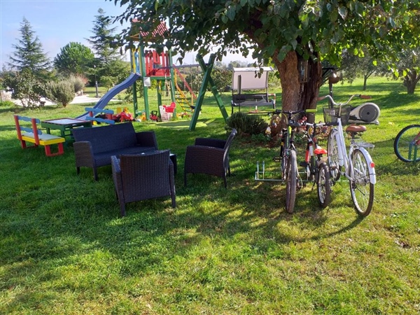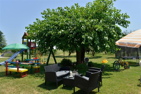 Kuhinja je srce doma – opremljena je svim potrebnim aparatima, uključujući hladnjak s velikim zamrzivačem, perilicu posuđa, štednjak s kombinacijom plina i struje, mikrovalnu pećnicu, kuhalo za vodu, toster, fritezu i aparat za kavu. Kamin u kuhinji pruža dodatnu toplinu i atmosferu, dok izlaz na natkrivenu terasu od 20 m² poziva na ugodne obroke na svježem zraku. U neposrednoj blizini terase nalazi se velika dječja igraonica s pješčanikom, ljuljačkama, golovima za mali nogomet, toboganom i spravama za vježbanje, a uz nju i bazen veličine 6x4 m s tušem, idealan za rashlađivanje i zabavu.