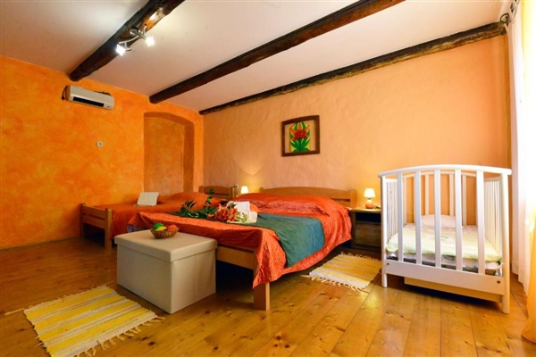 Na prvom katu kuće nalaze se dvije udobne spavaće sobe i još jedna kupaonica s tušem i WC-om. Soba Orange je prostrana i funkcionalna, s bračnim krevetom, dodatnim krevetom za jednu osobu, dječjim krevetićem, velikim ogledalom te noćnim ormarićima. Iz sobe se pruža prekrasan pogled na dječje igralište, maslinik i bazen.