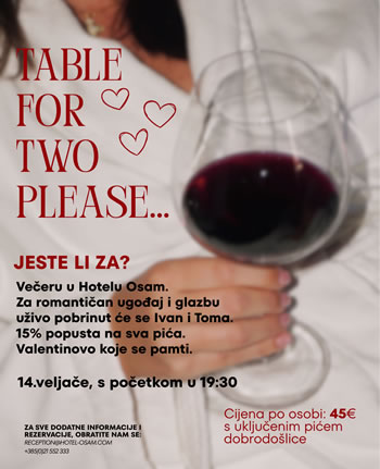 Neobavezna nadoplata na licu mjesta za romantičnu večeru 14.02. s pocetkom od 19:30 sati (po cijeni od 45,00 EUR za riblji ili mesni meni po osobi ovisno o odabiru) uz poseban Valentinovo meni i poklone iznenađenja.