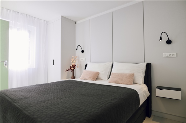 Spavaća soba s bračnim krevetom (160x200 cm) nalazi se na ulazu u apartman.