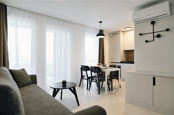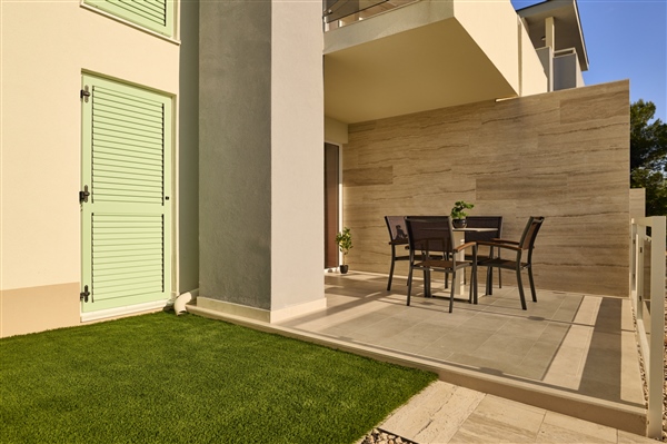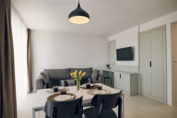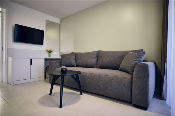 Moderan apartman s 1 spavaćom sobom i balkonom, površine 38 m2, nalazi se na 1. katu objekta i dostupan je isključivo stepenicama. Svaki je apartman klimatiziran, ima flat-screen TV sa satelitskim programima, sef, telefon i high-speed WI-FI internet. Spavaća soba s bračnim krevetom (160x200 cm) odvojena je od dnevnog dijela. Dnevni boravak ima izlaz na namješteni balkon s pogledom na obližnju borovu šumu.