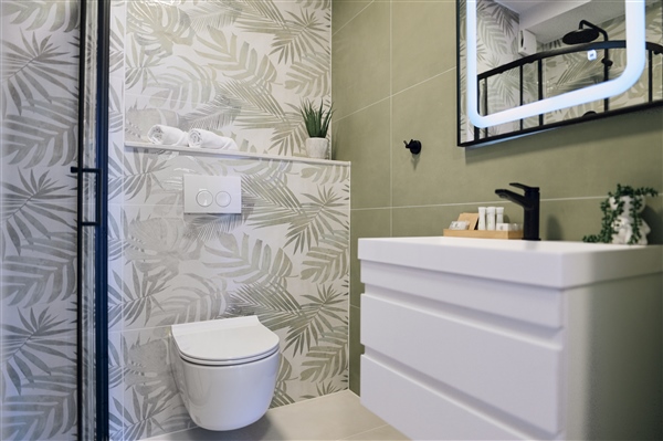 Komforna kupaonica s walk-in tušem sadrži wc, sušilo za kosu i perilicu rublja.