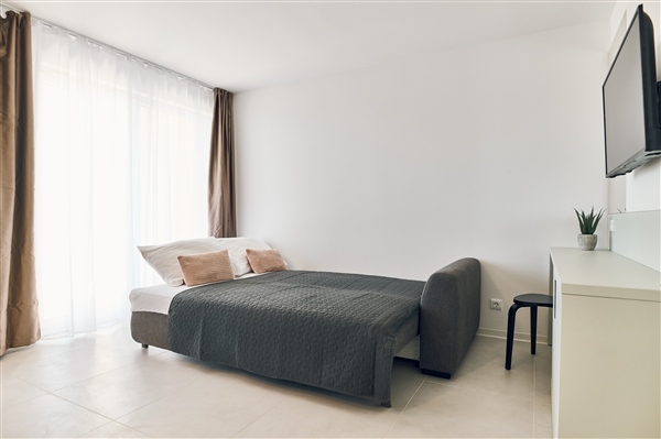Moderan studio apartman s balkonom, površine 32 m2, nalazi se na 1. katu objekta i dostupan je isključivo stepenicama. Svaki je apartman klimatiziran, ima flat-screen TV sa satelitskim programima, sef, telefon i high-speed WI-FI internet.