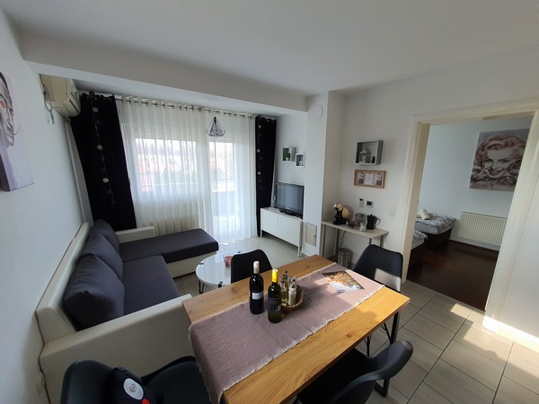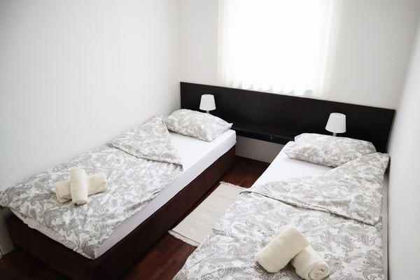 Ugodno uređen veliki apartman s dvije spavaće sobe s dva francuska ležaja koji se po potrebi mogu razdvojiti te ležajem u dnevnoj sobi na trosjedu na razvlačenje.