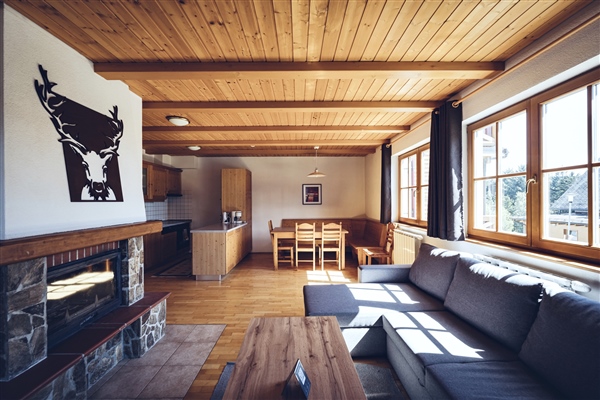 DELUX APARTMAN - prostrani apartman opremljen je kuhinjom (staklokeramička ploča, pećnica, toster, aparat za kavu, perilica suđa, kuhalo za vodu, hladnjak sa zamrzivačem), dnevnim boravkom s blagovaonicom (kauč koji se razvlači u udoban ležaj za jednu osobu odrasla osoba ili dvoje djece, TV kutak s prekrasnim kaminom), spavaća soba s bračnim krevetom (ili dva odvojena ležaja) i pomoćnim ležajem, druga spavaća soba s tri kreveta, dvije kupaonice s tušem ili kadom i wc.