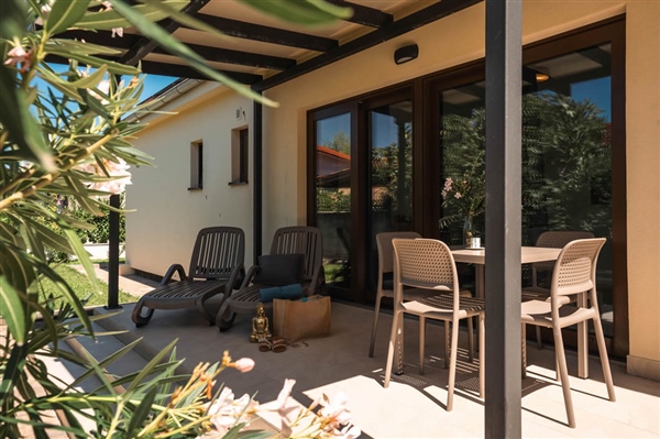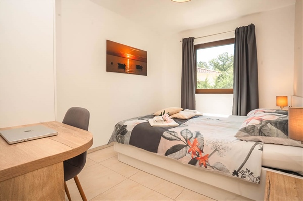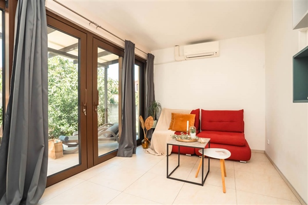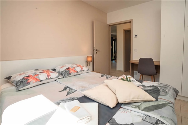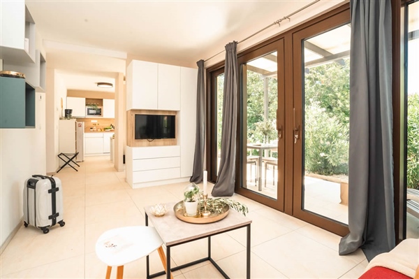 Apartman s jednom spavaćom sobom od 45 m² u prizemlju nudi ugodan smještaj s odvojenom spavaćom sobom i dnevnim boravkom u kojem se nalaze dva pomoćna ležaja. Uz vlastiti ulaz i klimatiziran prostor, gostima je na raspolaganju potpuno opremljena kuhinja s perilicom posuđa, mikrovalnom pećnicom i svim potrebnim priborom. Posebnu vrijednost čini privatna terasa s vanjskom blagovaonicom i pogledom na vrt, dok dodatni sadržaji poput perilice rublja, sefa i besplatnog Wi-Fi interneta osiguravaju praktičan i bezbrižan boravak.