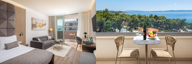 Deluxe sobe s balkonom predstavljaju savršen spoj luksuza i funkcionalnosti, pružajući gostima prostranost i vrhunsku udobnost. Ove jedinice krasi moderan interijer u pastelnim tonovima, opremljen visokokvalitetnim materijalima i namještajem po mjeri, dok velike staklene stijene propuštaju obilje prirodnog svjetla stvarajući prozračan i umirujući ambijent. Gostima je na raspolaganju prostran balkon s modernim namještajem, idealan za opuštanje uz šum mora ili pogled na planinu. Vrhunska oprema sobe uključuje king-size krevet, luksuznu kupaonicu s walk-in tušem ili kadom, besplatni Wi-Fi, pametni TV sustav, aparat za kavu te klimatizaciju s individualnim podešavanjem za potpuni komfor.