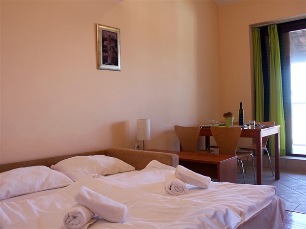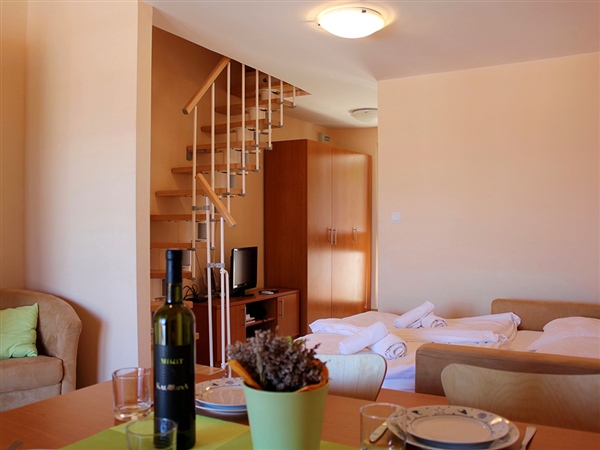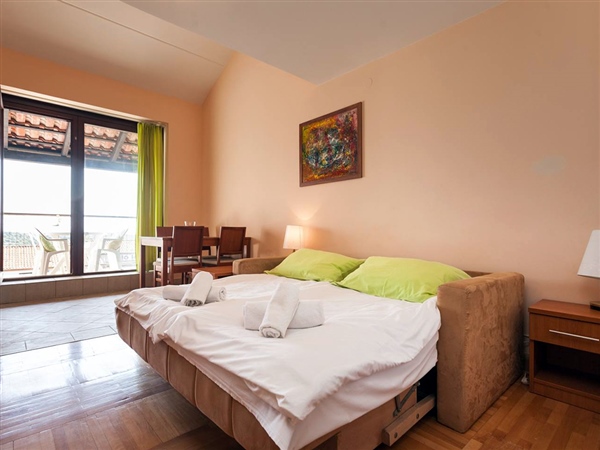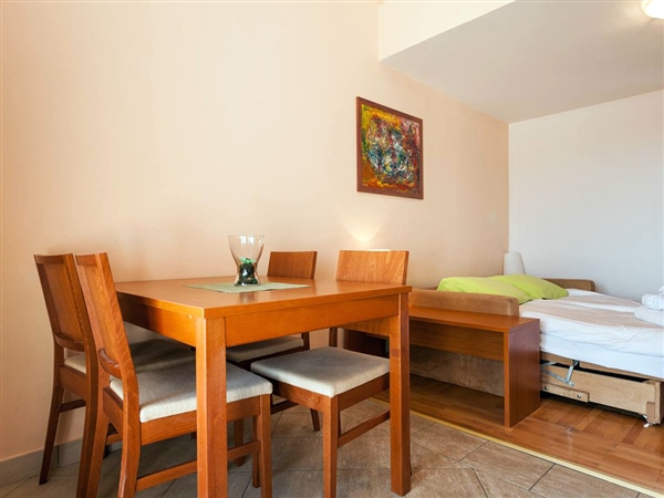 Naš najveći apartman nudi dodatan prostor koji možete koristiti za udobnost, ili dovesti još ljudi. Također, ima odvojenu spavaću sobu i potpuno opremljenu kuhinju. (50m2; 5 osoba).
