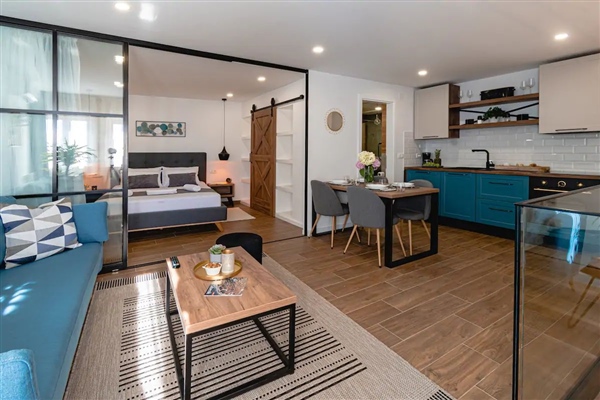 Apartman, površine 75 m2, ima odvojenu spavaću sobu, kupaonicu i dnevni boravak, dva smart TV-a, dva klima uređaja i dvije tuš kabine.