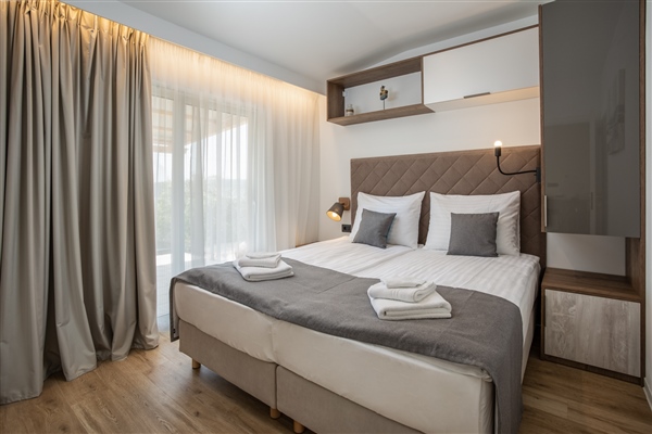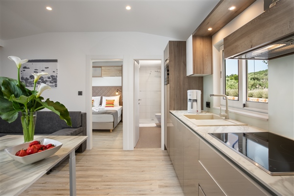 Svaka luksuzna kuća za odmor u svojih 45 m2 površine nudi prostranu dnevnu sobu, potpuno opremljenu kuhinju, 2 spavaće sobe s vlastitim kupaonicama i terasu s nezaboravnim zalaskom sunca nad Puntarskom valom.