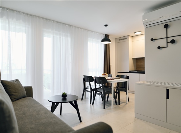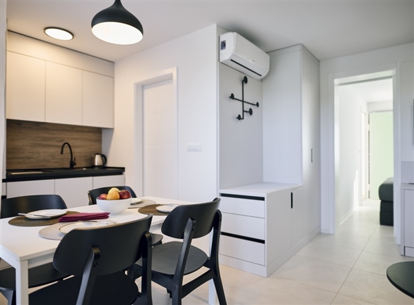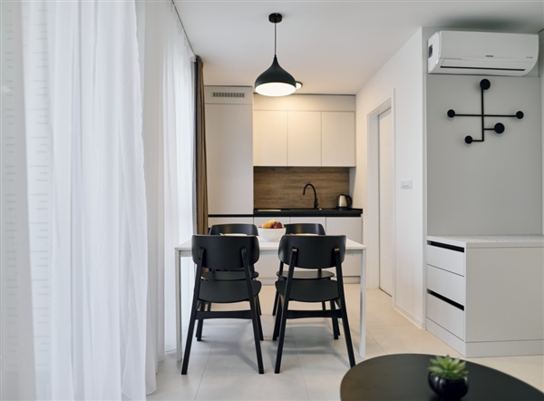 Elegantna i funkcionalna kuhinja uključuje hladnjak sa zamrzivačem, perilicu posuđa, pećnicu, električnu ploču za kuhanje, aparat za kavu, kuhalo za vodu i osnovnu opremu za kuhanje te blagovaonicu za 4 osobe. Komforna kupaonica s walk-in tušem opremljena je sušilom za kosu i perilicom rublja. Gostima su tijekom boravka na raspolaganju ručnici i posteljina (1 set tijekom boravka). Finalno čišćenje apartmana je uključeno u cijenu smještaja