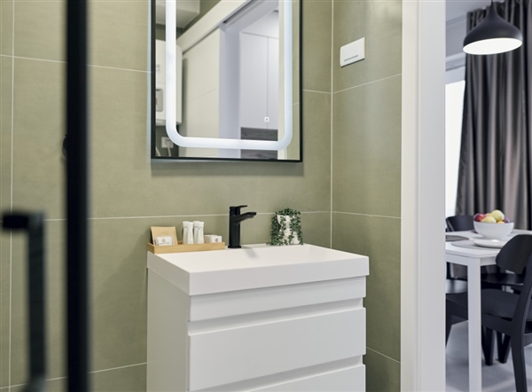 Komforna kupaonica s walk-in tušem opremljena je sušilom za kosu i perilicom rublja. Gostima su tijekom boravka na raspolaganju ručnici i posteljina (1 set tijekom boravka). Finalno čišćenje apartmana je uključeno u cijenu smještaja