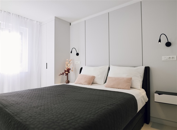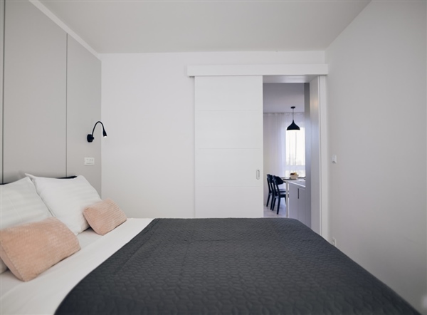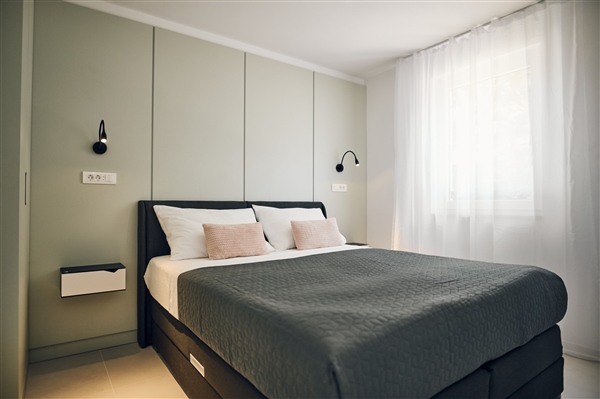 Spavaća soba s bračnim krevetom (160x200 cm) nalazi se na ulazu u apartman. Iz spavaće sobe ulazi se u prostrani dnevni boravak i kuhinju s blagovaonicom te ima balkonili terasu na morskoj strani. Elegantna i funkcionalna kuhinja sadrži hladnjak sa zamrzivačem, perilicu posuđa, pećnicu, električnu ploču za kuhanje, aparat za kavu, kuhalo za vodu, osnovnu opremu za kuhanje te blagovaonicu za 4 osobe. Na sofi na razvlačenje (160x200 cm) u dnevnom boravku moguće je smjestiti još 2 osobe (uz napodoplatu).