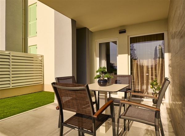Moderan apartman s 1 spavaćom sobom i balkonom ili terasom, površine 38 m2, dostupan isključivo stepenicama. Svaki je apartman klimatiziran, ima flat-screen TV sa satelitskim programima, sef, telefon i high-speed WI-FI internet. Spavaća soba s bračnim krevetom (160x200 cm) odvojena je od dnevnog dijela. Dnevni boravak ima izlaz na namješteni balkon il iterasu okrenutu moru. Na sofi na razvlačenje (160x200 cm) u dnevnom boravku moguće je smjestiti još 2 osobe (uz napodoplatu).