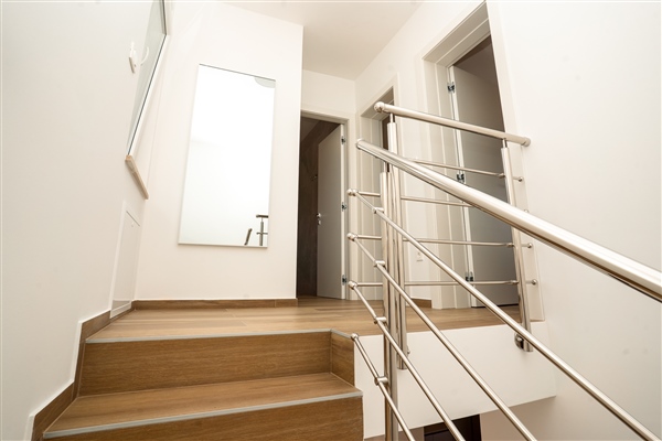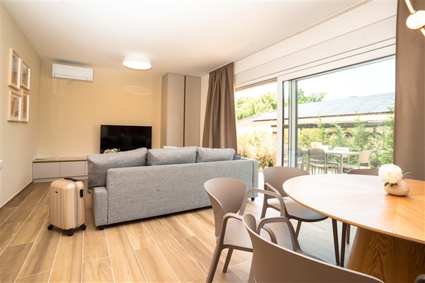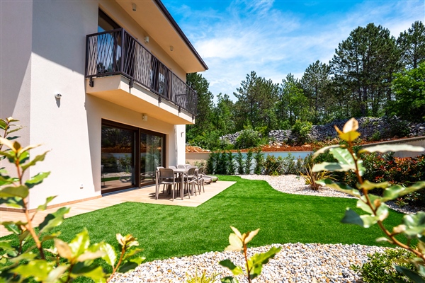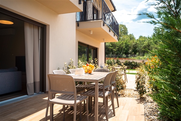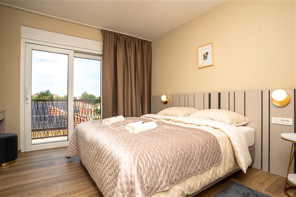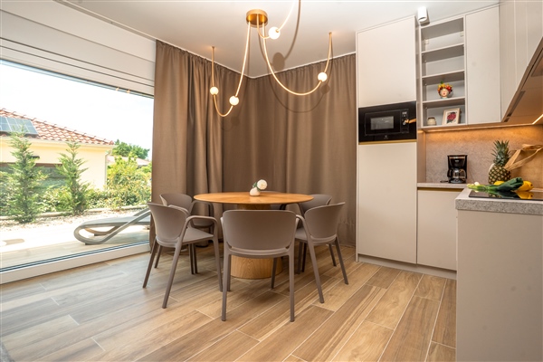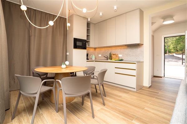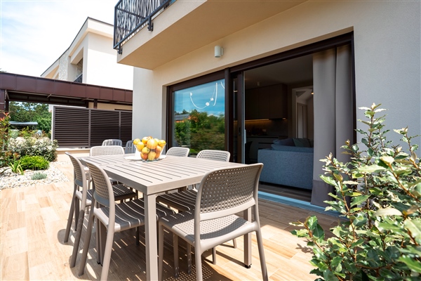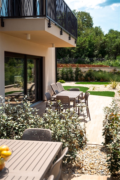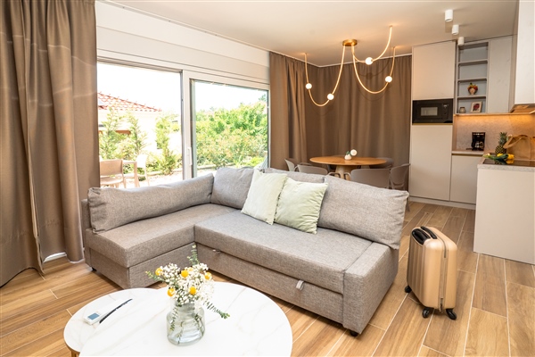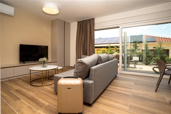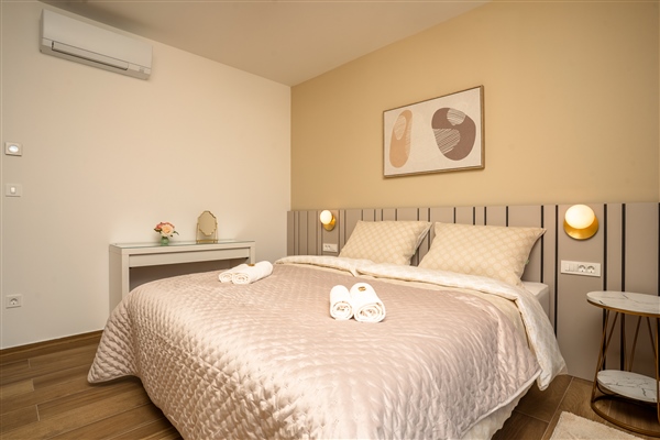 Deluxe apartman s dvije spavaće sobe od 150 m² nudi vrhunsku udobnost s dvije spavaće sobe opremljene velikim bračnim krevetima te prostranim dnevnim boravkom s kaučem na rasklapanje. Uz dvije moderne kupaonice i privatni ulaz, gostima je na raspolaganju potpuno opremljena kuhinja sa svim aparatima, uključujući perilicu posuđa i mikrovalnu pećnicu, te praktični sadržaji poput perilice rublja i sefa. Poseban šarm prostoru daje velika terasa s vanjskom blagovaonicom i opuštajućim pogledom na vrt, dok klimatizirani interijer i besplatan Wi-Fi osiguravaju ugodan boravak u mirnom okruženju.