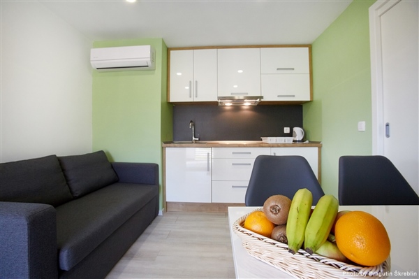Suvremeno opremljene mobilne kućice veličine su 36 m² + 18 m² natkrivene terase. Imaju 2 kupaonice (WC i tuš), 1 spavaću sobu s bračnim ležajem, 1 spavaću sobu s razdvojenim ležajevima, dnevni boravak s dodatnim rasklopivim ležajem, kompletno opremljenu kuhinju (hladnjak, indukcijska ploča za kuhanje, mikrovalna pećnica), klimu, IPTV, LED TV, WI-FI i terasu sa sjedećom garniturom i ležaljkama.