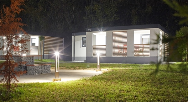 Suvremeno opremljene mobilne kućice veličine su 36 m² + 18 m² natkrivene terase. Imaju 2 kupaonice (WC i tuš), 1 spavaću sobu s bračnim ležajem, 1 spavaću sobu s razdvojenim ležajevima, dnevni boravak s dodatnim rasklopivim ležajem, kompletno opremljenu kuhinju (hladnjak, indukcijska ploča za kuhanje, mikrovalna pećnica), klimu, IPTV, LED TV, WI-FI i terasu sa sjedećom garniturom i ležaljkama.