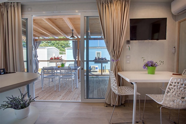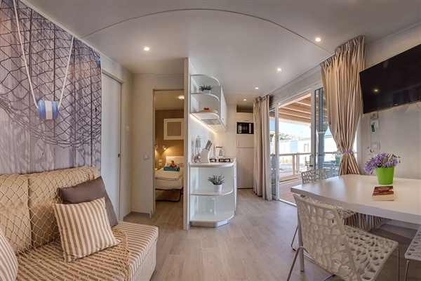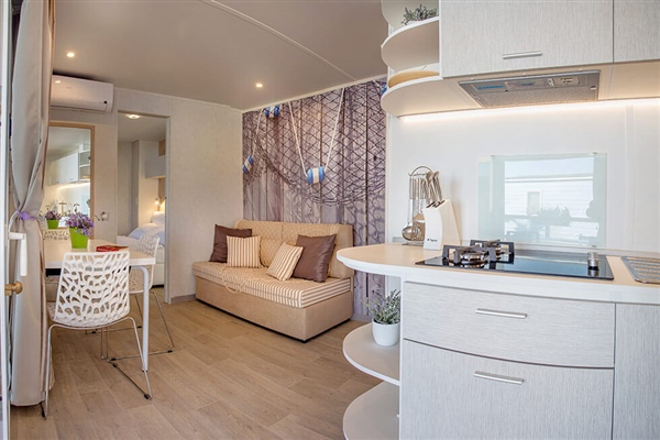 Svi camping homeovi nude dvije spavaće sobe (jednu s bračnim, a drugu s dva odvojena kreveta), dnevni boravak s kaučem na razvlačenje, dobro opremljenu kuhinju, dvije kupaonice i prostranu terasu sa sjedećom garniturom i ležaljkama.