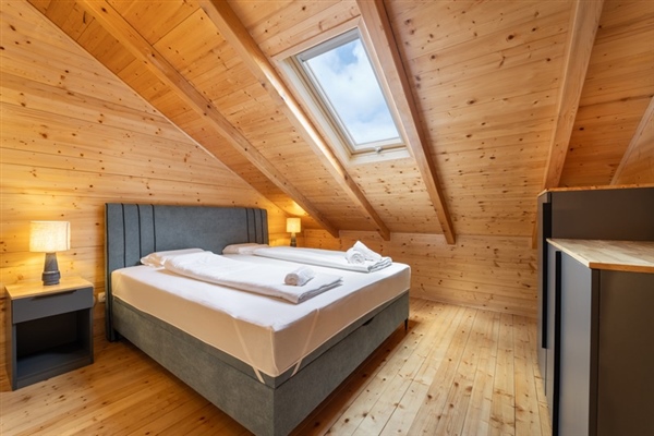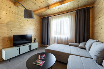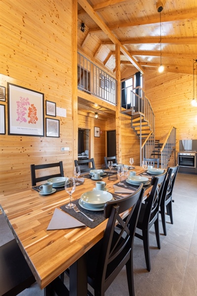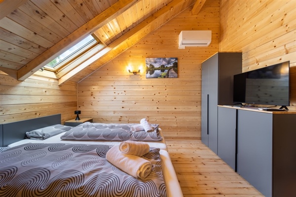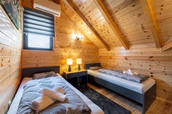 Ova samostojeća drvena kuća sastoji se od dvije spavaće sobe, moderno opremljene kupaonice te prostranog dnevnog boravka koji je povezan s kuhinjom i blagovaonicom.