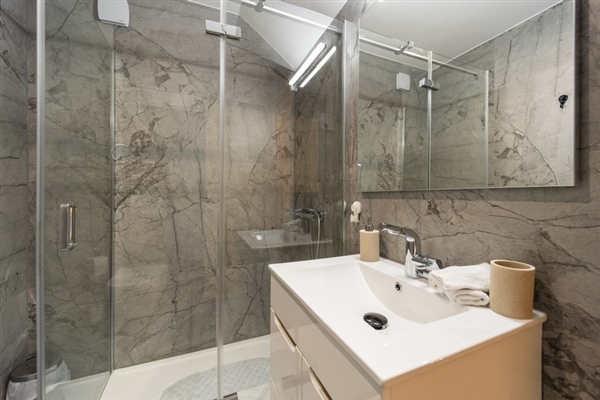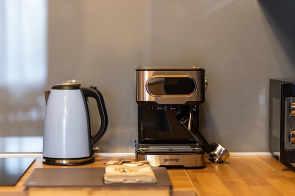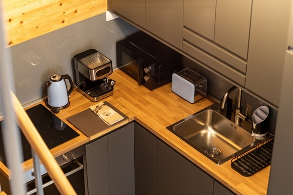 Kuhinja sadrži sve potrebne uređaje za samostalnu pripremu jela, uključujući hladnjak i perilicu posuđa. Poseban naglasak stavljen je na vanjski prostor, odnosno privatnu terasu koja služi kao produžetak dnevnog boravka.
