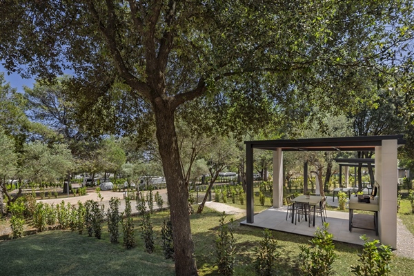 Poseban čar boravka u Premium kućicama krije se na prostranoj, natkrivenoj terasi koja služi kao produženi dnevni boravak na svježem zraku. Opremljena udobnom lounge garniturom, velikim stolom i ležaljkama, ona je savršeno mjesto za duge ljetne večeri ili opuštanje uz knjigu dok vas okružuje miris istarskog zelenila. Gostima je na raspolaganju i zajednički vanjski prostor za roštilj, idealan za pripremu lokalnih delicija.