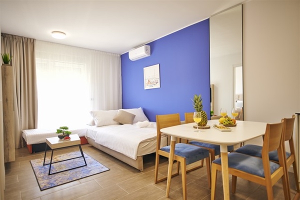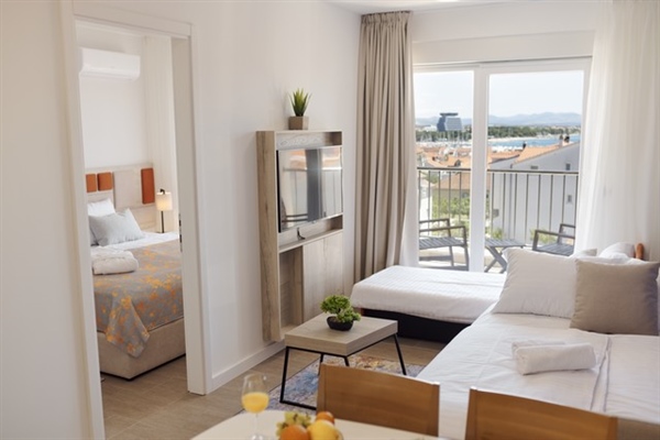Apartman površine 43 m2 ima vlastitu kupaonicu s tušem, mini kuhinju s blagovaonicom, dnevni boravak s kaučem i balkon s prostorom za sjedenje. Također ima sef, besplatni toaletni pribor, sušilo za kosu, ormar, ogrtači i papuče, SAT TV, telefon, hladnjak, kuhalo za vodu i osnovnu opremu za kuhanje. Posteljina i ručnici su na raspolaganju. Veličina kreveta: 2 odvojena kreveta 100 x 200 cm spojena u bračni krevet (u spavaćoj sobi), kauč na razvlačenje 160 x 200 cm se nalazi u dnevnom boravku.