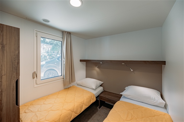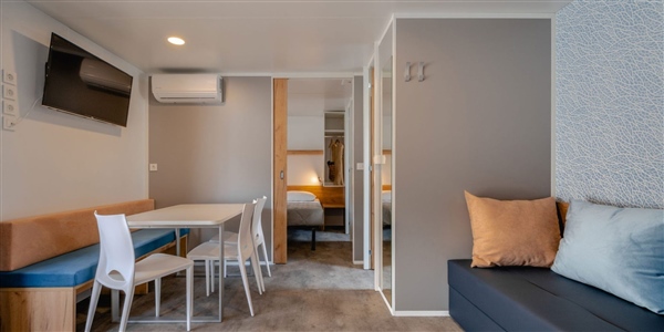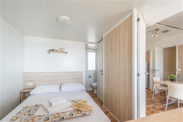 Ove mobilne kućice imaju jednu spavaću sobu s bračnim krevetom i kupaonicom, prostranu dječju sobu s četiri ležaja i prostorom za igranje, dodatnu kupaonicu, kuhinju (perilica posuđa, mikrovalna pećnica, indukcijska ploča, hladnjak, zamrzivač) s dnevnim boravkom i blagovaonom, natkrivenu i ograđenu terasu s vrtnom garniturom te parkirno mjesto.