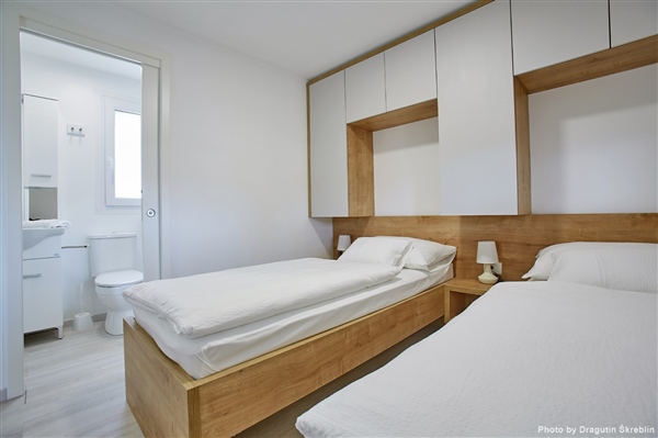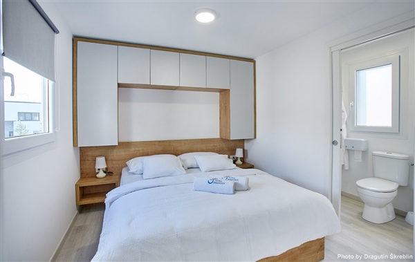 Suvremeno opremljene mobilne kućice veličine su 36 m² + 18 m² natkrivene terase. Imaju 2 kupaonice (WC i tuš), 1 spavaću sobu s bračnim ležajem, 1 spavaću sobu s razdvojenim ležajevima, dnevni boravak s dodatnim rasklopivim ležajem, kompletno opremljenu kuhinju (hladnjak, indukcijska ploča za kuhanje, mikrovalna pećnica), klimu, IPTV, LED TV, WI-FI i terasu sa sjedećom garniturom i ležaljkama.