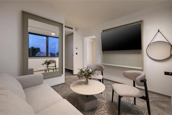 Ovaj elegantni suite od 39 m² nudi izvrsno obiteljsko iskustvo prožeto stilom i udobnošću. Prostor je osmišljen za kvalitetno provođenje vremena s najdražima u prostranom dnevnom boravku, dok vrhunski king size krevet osigurava miran i regenerirajući san. Uz moderan dizajn i klimatizaciju, suite sadrži flat-screen TV, besplatan Wi-Fi, sef i mini-bar. Poseban komfor pruža prostrana kupaonica koja nudi obilje prostora za sve potrebe tijekom odmora, čineći ovaj suite savršenim utočištem za one koji traže dodatnu širinu i luksuznu notu u Vodicama.