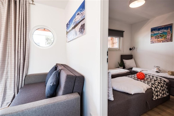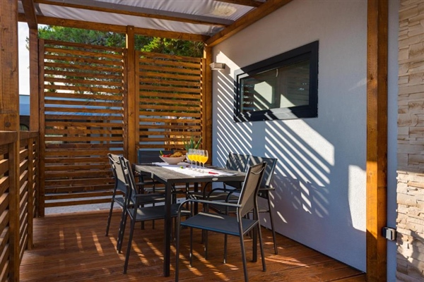S prostranim interijerom od 36 m² i dodatnih 20 m² natkrivene terase s garniturom za sjedenje, idealne su za cjelodnevni boravak na svježem zraku. Kućice su u potpunosti klimatizirane i opremljene za smještaj do 7 osoba (5 odraslih + 2 djece).