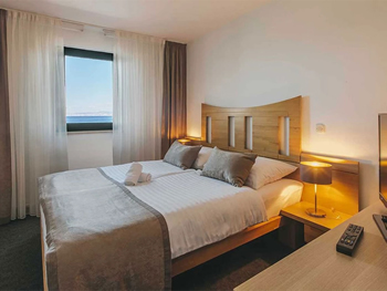 Standard dvokrevetna soba s pogledom na more pruža nezaboravan doživljaj buđenja uz šum valova i panoramu Jadrana. Unutrašnjost je opremljena udobnim bračnim krevetom za dvije osobe, a prostor je u potpunosti klimatiziran sustavom hlađenja koji osigurava ugodnu temperaturu tijekom cijelog boravka. Gosti na raspolaganju imaju privatnu kupaonicu opremljenu tušem ili kadom, sušilom za kosu te biranom hotelskom kozmetikom. Uz funkcionalan mini bar i direktnu telefonsku liniju, soba nudi i moderne sadržaje poput satelitske televizije te besplatnog bežičnog interneta. Ova nepušačka jedinica osmišljena je s posebnim naglaskom na pogodnosti za obitelji, a u njoj su dobrodošli i kućni ljubimci, što je čini savršenim izborom za opušten i bezbrižan odmor na samoj obali.