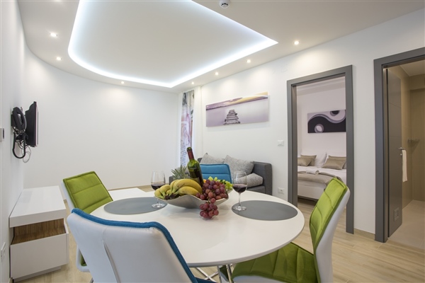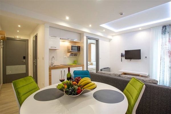 Suvremeni, moderni i prostrani, apartmani imaju sve što je potrebno za savršen boravak. Studio apartman s pogledom na vrt površine je cca 25 m2 i ima terasu površine 7 m2.