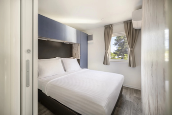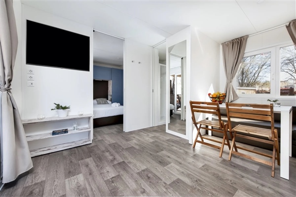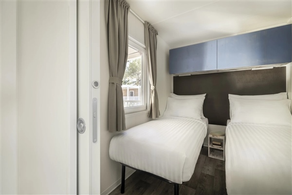 Uživajte u vrhunskom komforu moderne mobilne kućice čiji je glavni adut prostrana, natkrivena terasa s privatnim roštiljem i elegantnim zastorima za potpunu intimu. Unutrašnjost nudi dvije spavaće sobe i dvije kupaonice, što je čini savršenim izborom za obitelji ili parove koji traže dodatni prostor i privatnost.