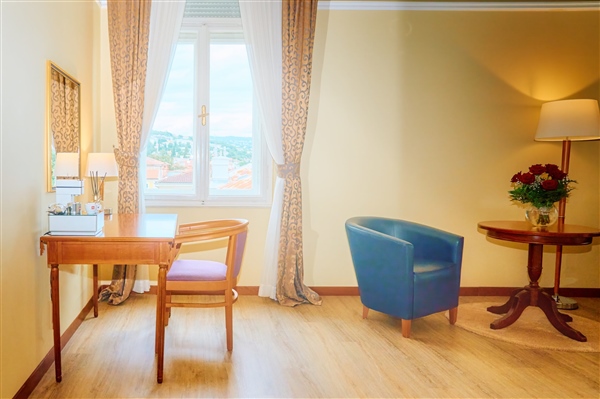 Uživajte u 20 m2 čistog komfora s prekrasnim pogledom na opatijske parkove i plavo more. Ova svijetla, klimatizirana soba nudi sve za savršen odmor: besplatan brzi Wi-Fi, satelitsku TV, minibar i potpuno opremljenu kupaonicu. Prostor je prilagođen vašim potrebama uz pisaći stol i telefon, a boravak je dopušten i vašim kućnim ljubimcima. Za najmlađe do 3 godine osiguran je besplatan dječji krevetić. Doživite harmoniju mora i zelenila u samom srcu Opatije.