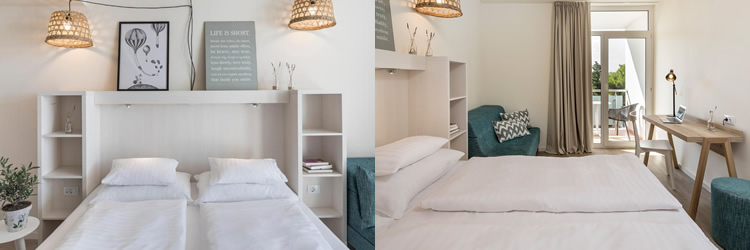 Moderno i veselo utočište, posebno osmišljeno za potrebe roditelja i dvoje djece. Na otprilike 20 m² funkcionalnog prostora, soba spaja mediteransku estetiku s praktičnim rasporedom koji uključuje udoban bračni krevet te pomoćni ležaj ili sofu na razvlačenje za najmlađe. Interijerom dominiraju svijetli tonovi i moderan namještaj, a većina soba nudi i vlastiti balkon s pogledom na mirisni hotelski park.