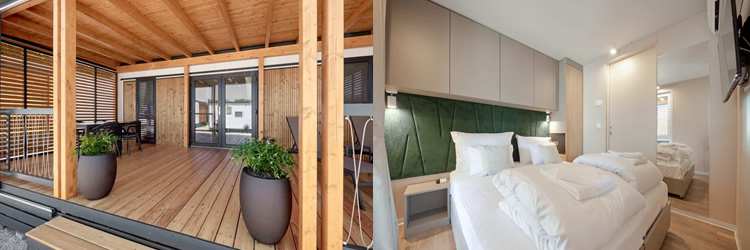 Deluxe Komfort mobilne kućice smještene su na pomno odabranim lokacijama unutar kampa koje osiguravaju potpunu privatnost i pružaju jedinstven doživljaj boravka u zelenilu uz sve pogodnosti suvremenog doma. Unutrašnji prostor od 34 m² maksimalno je iskorišten i opremljen sustavom klimatizacije u svakoj prostoriji, dok podno grijanje osigurava vrhunsku udobnost tijekom cijele godine. Interijer se sastoji od dvije elegantne spavaće sobe i dvije zasebne kupaonice s tuš kabinama, što jamči visoku razinu funkcionalnosti za obitelji ili grupe do šest osoba.